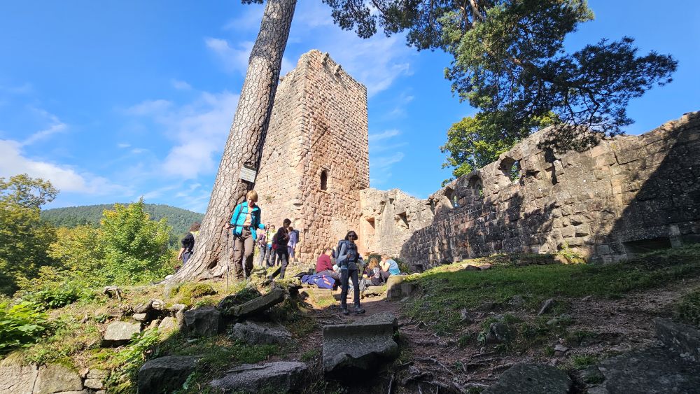 Bei glücklicherweise trockenem Wetter führte unser Weg zunächst stetig bergauf in Richtung der eindrucksvoll gelegenen Burgruine Lützelhardt. Bei kleinen Rätselaufgaben wurde gemeinsam geknobelt, gelacht und diskutiert.