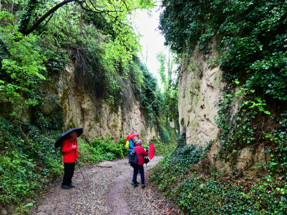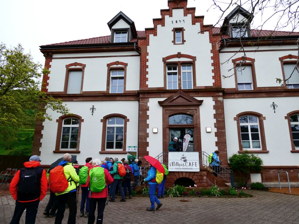 Gegen Mittag erreichten wir unsere Mittagsrast im wunderschönen Rothus-Café. Nach der Stärkung – es regnete immer noch – machten wir uns auf den Rückweg nach Endingen. Zunächst führte der Weg wieder bergauf, oben angekommen bot sich ein Blick auf Kiechlinsbergen. Weiter ging es nach Amoltern, vorbei an der Amolterer Heide und schließlich durch einen Hohlweg zurück nach Endingen.