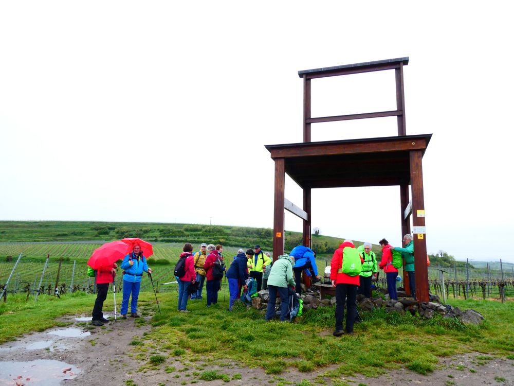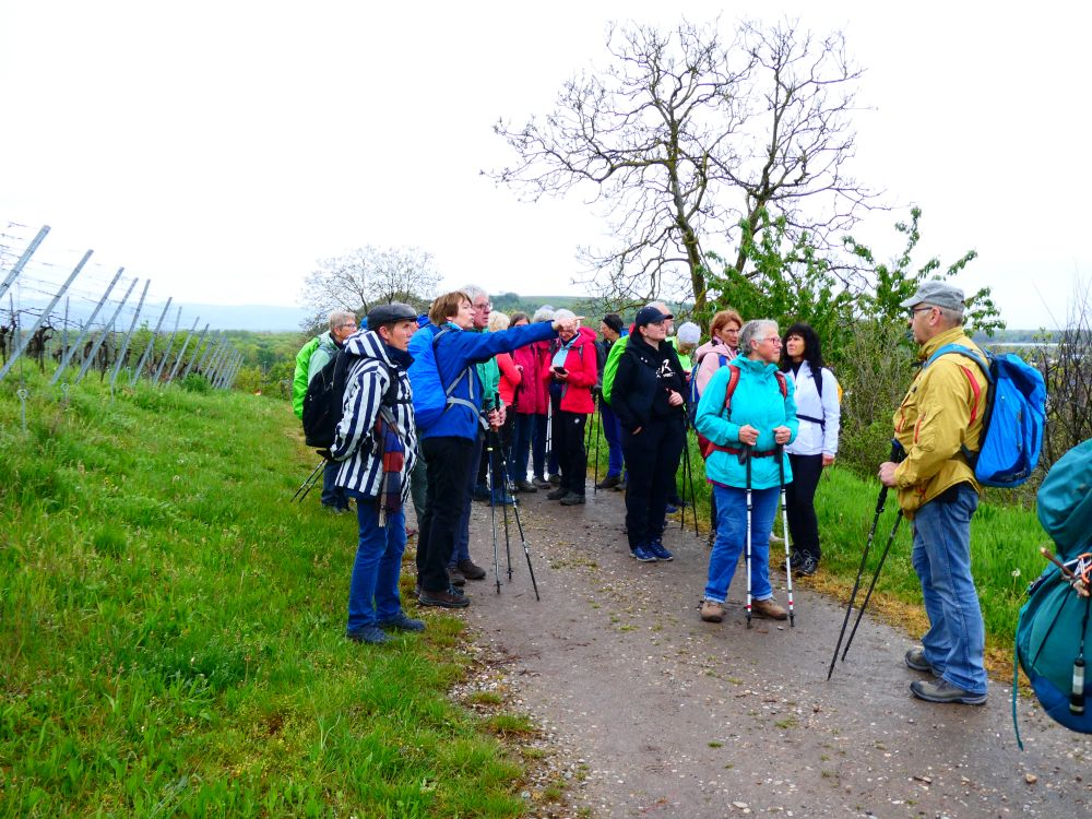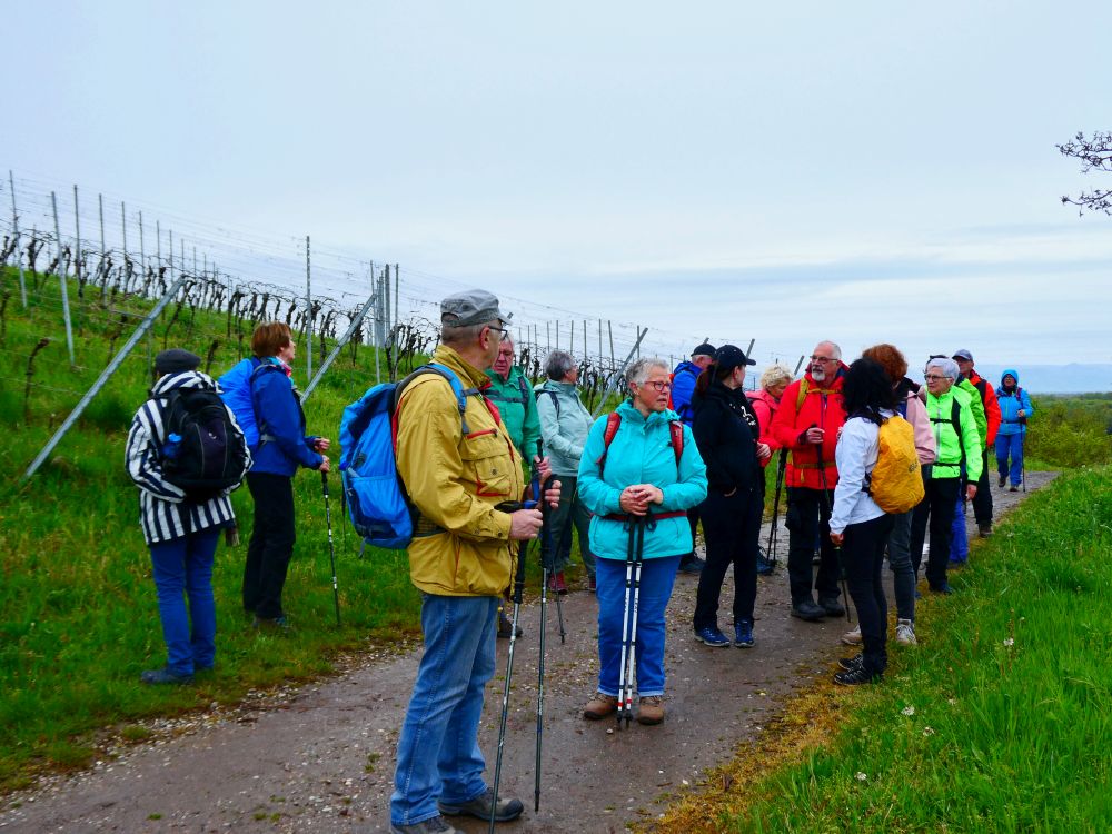 In Sasbach angekommen und nach einer kurzen Begrüßung der Teilnehmenden machten wir uns auf den Weg. Unser Themenweg bot eine Mischung aus Naturerlebnis, Geschichte und kulturellen Einblicken. Eigentlich hätten wir unterwegs reizvolle Ausblicke auf die Rheinebene, die Vogesen und den Schwarzwald genießen können – doch das trübe, regnerische Wetter ließ dies leider nicht zu.