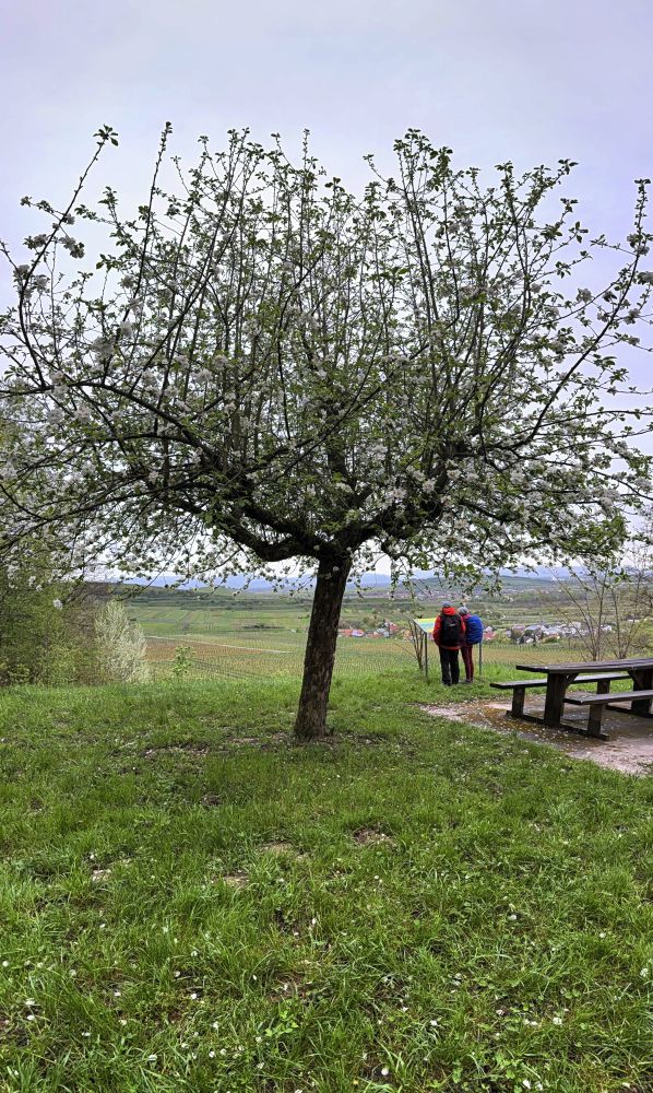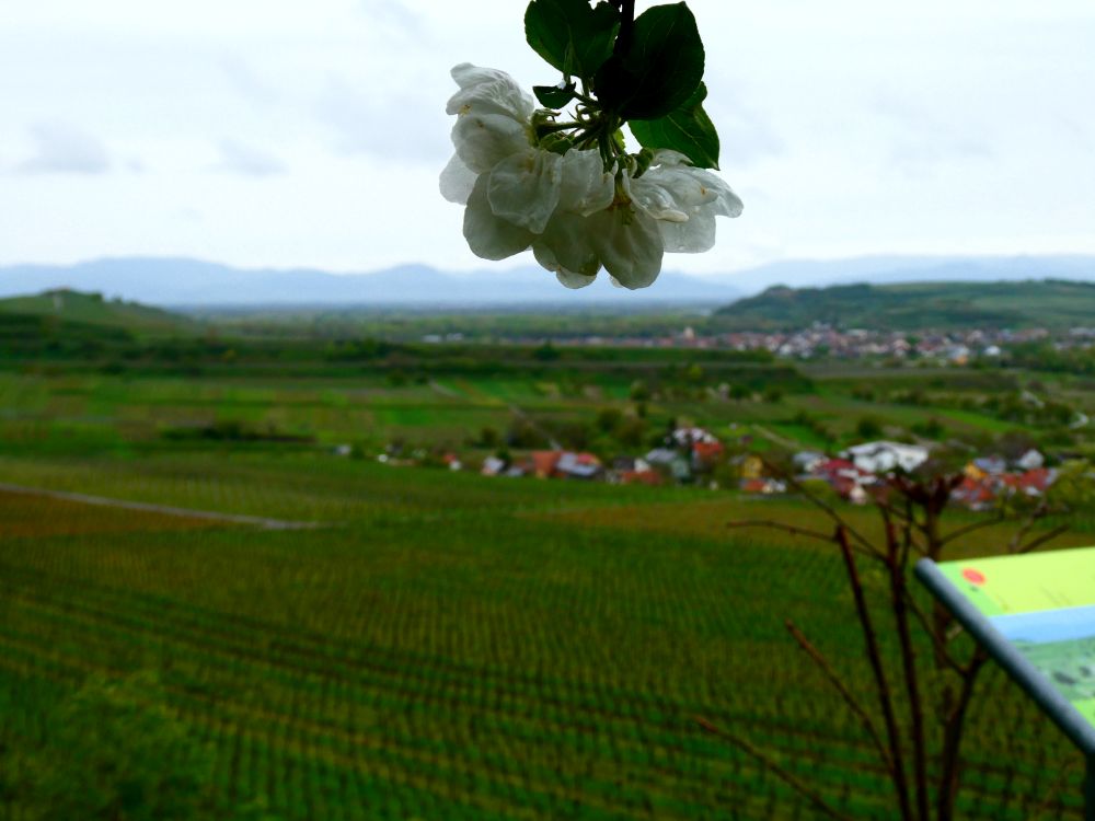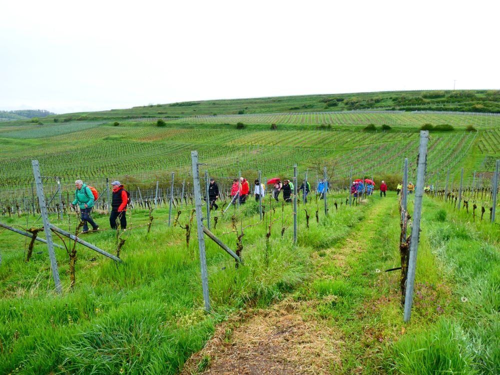Der Weg führte uns durch die malerische Natur des nördlichen Kaiserstuhls, wo wir noch einige wenige Kirsch- und Apfelblüten entdecken konnten. Stetig aufwärts wandernd erreichten wir das Gewann „Gestühl“ bei Leiselheim, dass dem Kaiserstuhl vermutlich seinen Namen gab. Dort legten wir eine kleine Rast ein, bevor wir nach Leiselheim hinabstiegen und anschließend wieder aufwärts wanderten – mit gelegentlichem Blick in die Ferne.