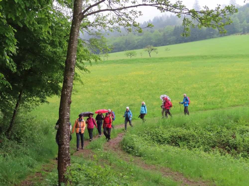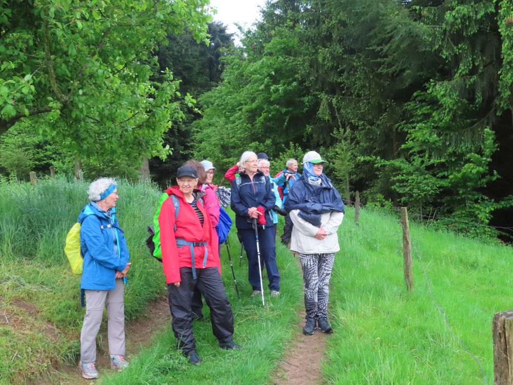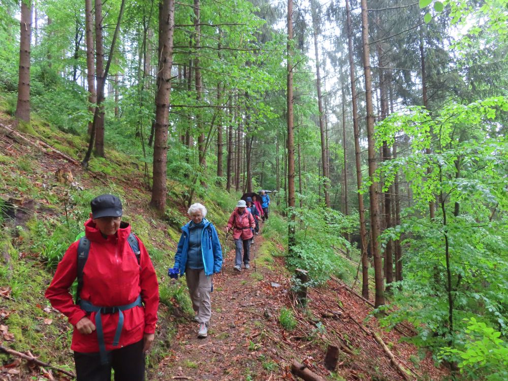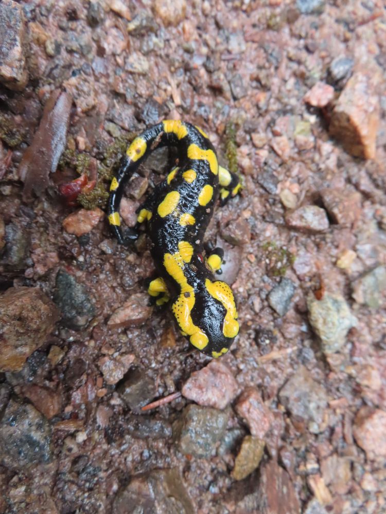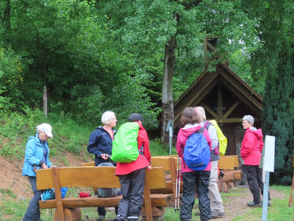 Zunächst wanderten wir östlich zum Schwimmbad um dann Richtung Süden zu schwenken und zunächst auf geteerter Strasse zum Standort Schönberg zu gelangen. Weiter ging es dann über breite Waldwege und schöne Pfade durch den Hochwald zur Paulischanze. Unterwegs trafen wir noch auf klein „Lurchi“, der angesichts der Wanderer in Schockstarre verfiel. Gottfried „rettete“ den kleinen Feuersalamander dann indem er ihn zur Seite in das Gras trug. Bei der Paulischanze thront die Paulihütte über dem Kinzigtal. Der Regen hatte bis dahin nachgelassen und Zeitweise auch mal aufgehört. An der Paulihütte legten wir unsere etwas vorgezogene Pause ein, da hier alle einen trockenen Sitzplatz mit Tisch vorfanden. Nach der Pause mit Vesper, Süßigkeiten gereicht von Gottfried und einem „Likörchen“ von Andrea ging es gut gestärkt weiter. In der Zwischenzeit hat auch der Regen ganz aufgehört.