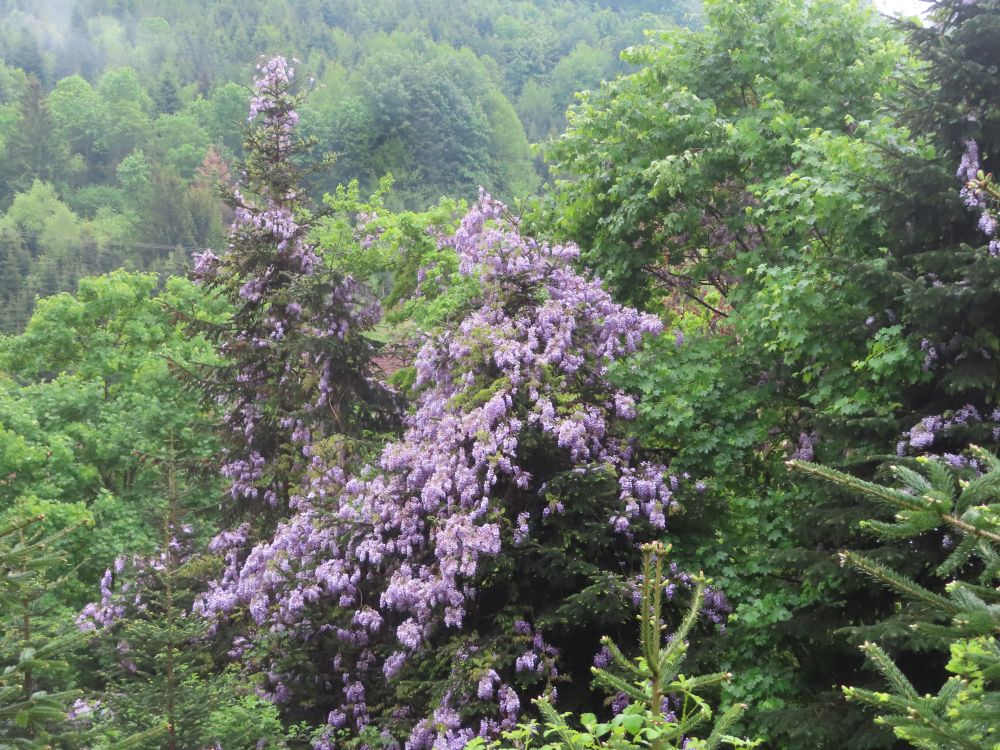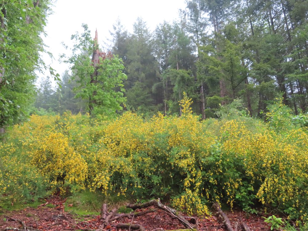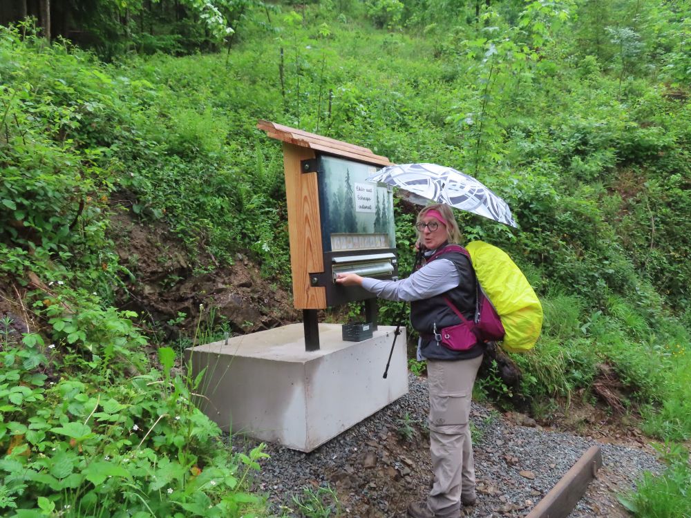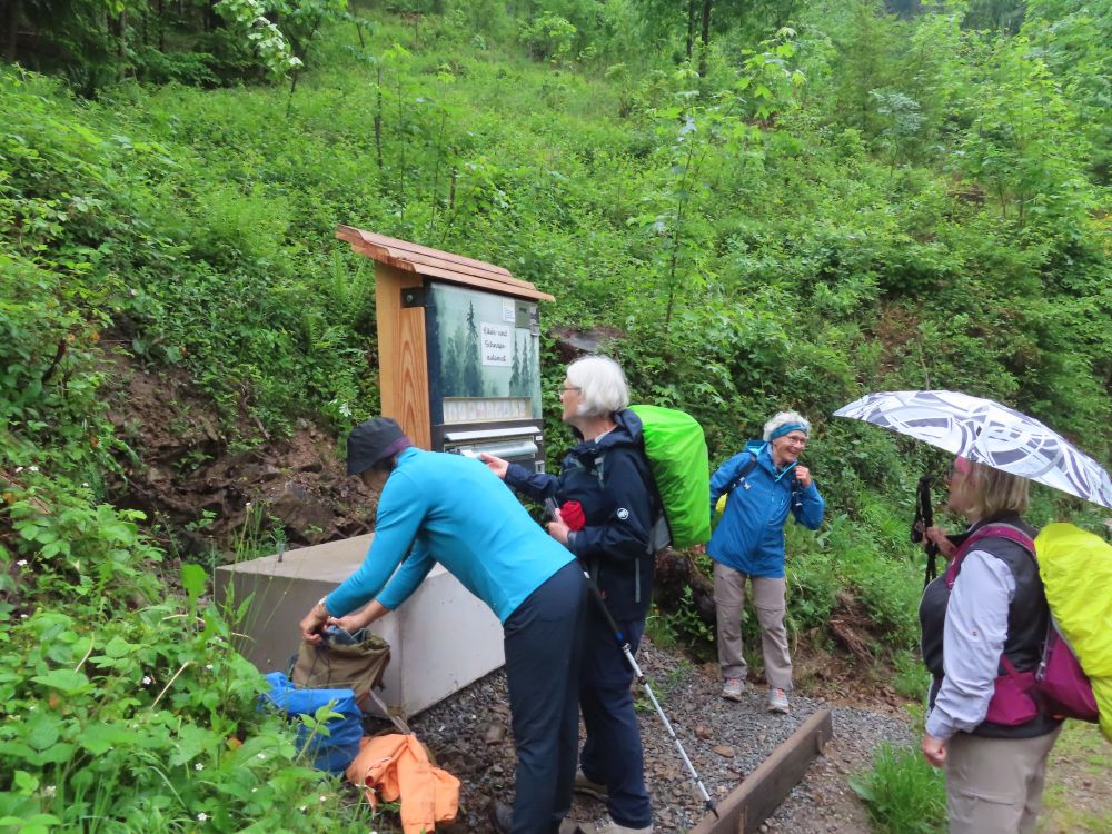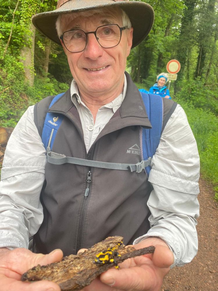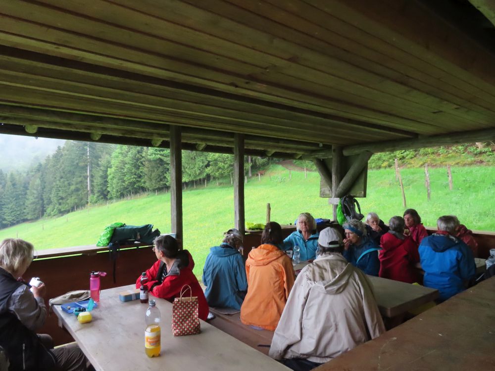 Zunächst wanderten wir östlich zum Schwimmbad um dann Richtung Süden zu schwenken und zunächst auf geteerter Strasse zum Standort Schönberg zu gelangen. Weiter ging es dann über breite Waldwege und schöne Pfade durch den Hochwald zur Paulischanze. Unterwegs trafen wir noch auf klein „Lurchi“, der angesichts der Wanderer in Schockstarre verfiel. Gottfried „rettete“ den kleinen Feuersalamander dann indem er ihn zur Seite in das Gras trug. Bei der Paulischanze thront die Paulihütte über dem Kinzigtal. Der Regen hatte bis dahin nachgelassen und Zeitweise auch mal aufgehört. An der Paulihütte legten wir unsere etwas vorgezogene Pause ein, da hier alle einen trockenen Sitzplatz mit Tisch vorfanden. Nach der Pause mit Vesper, Süßigkeiten gereicht von Gottfried und einem „Likörchen“ von Andrea ging es gut gestärkt weiter. In der Zwischenzeit hat auch der Regen ganz aufgehört.