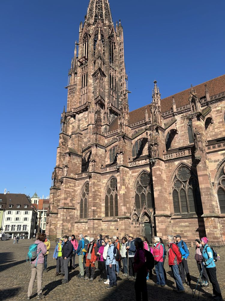 Am Freiburger Hauptbahnhof, unserem Treffpunkt 2, waren wir dann durch 4 Bahn-Zusteiger und einen Autofahrer tatsächlich 35 fröhliche Leute, mit denen wir zunächst 1,5 Km durch Freiburgs Innenstadt marschiert sind. Unser Schlussmann Ralf hatte dabei stets ein wachsames Auge am Ende, so dass keiner verloren ging.