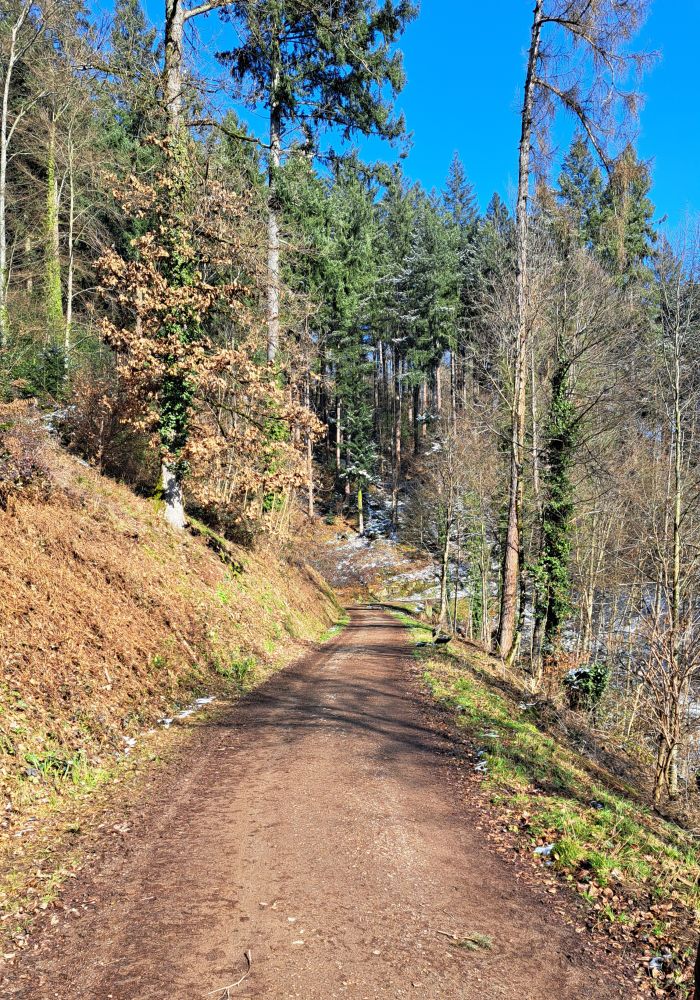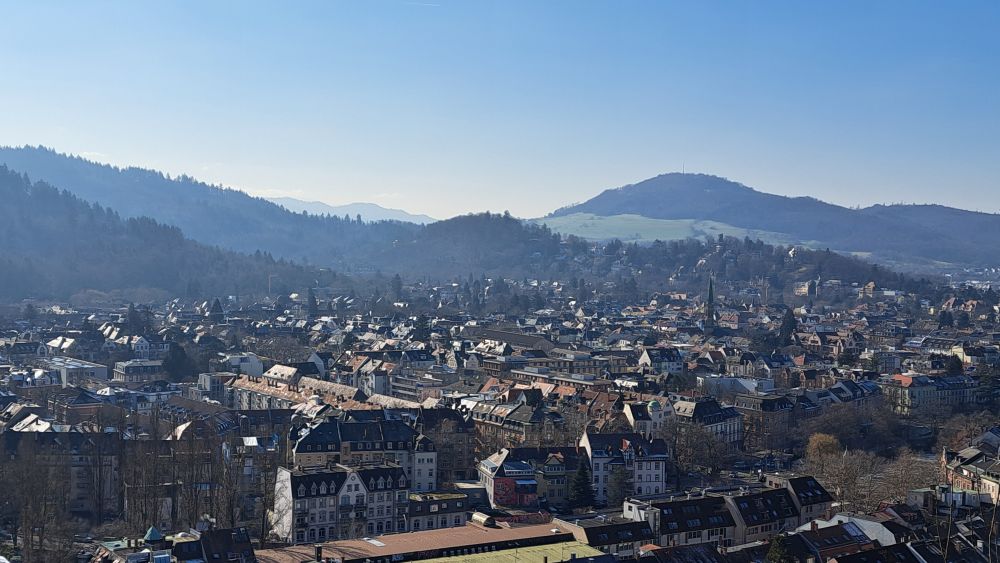 Gutgelaunt traten wir alle zusammen unseren Rückweg an. Jetzt befanden wir uns auf der anderen Seite des Schlossbergs und hatten bei bestem Wetter größtenteils freie Sicht ins Tal auf die Stadteile Littenweiler, Waldsee und Wiehre. In der Ferne konnte man viele Köpfe sehen: Rehagkopf, Schwarzkopf, Bleichdobelkopf und Kreuzkopf.