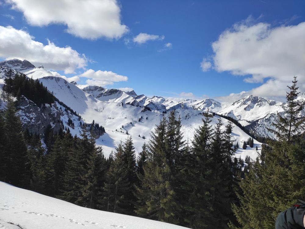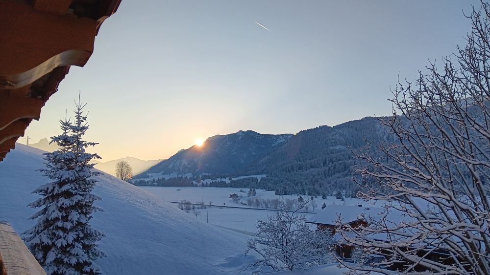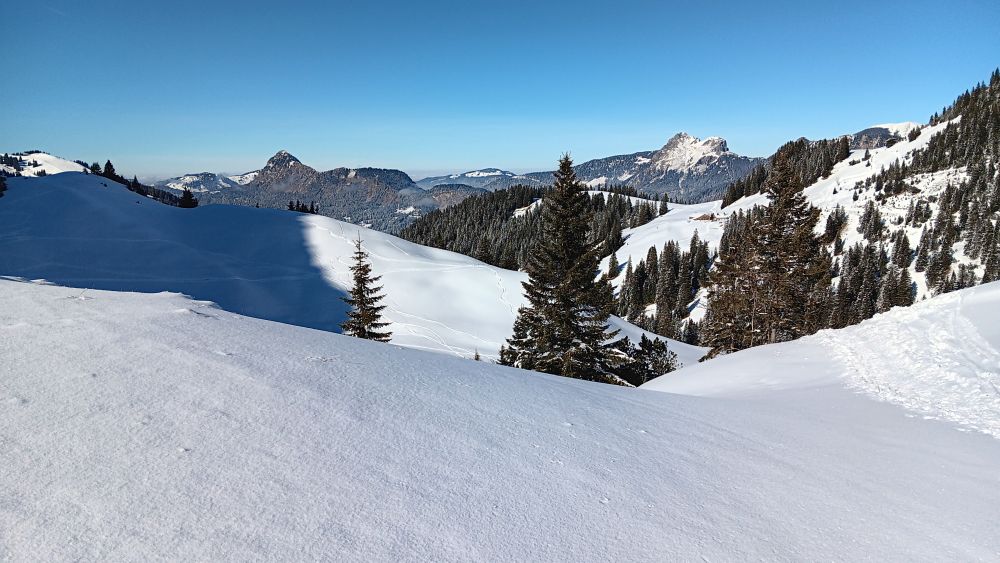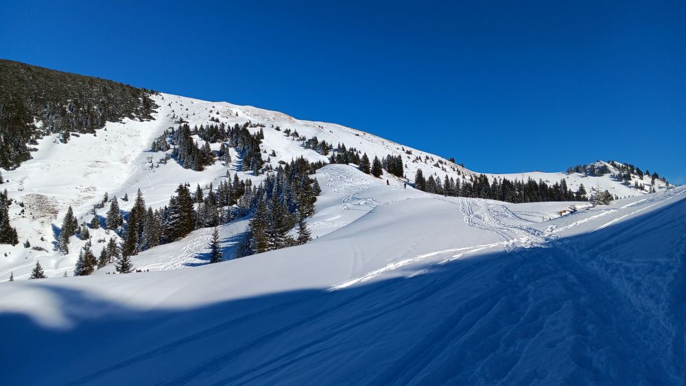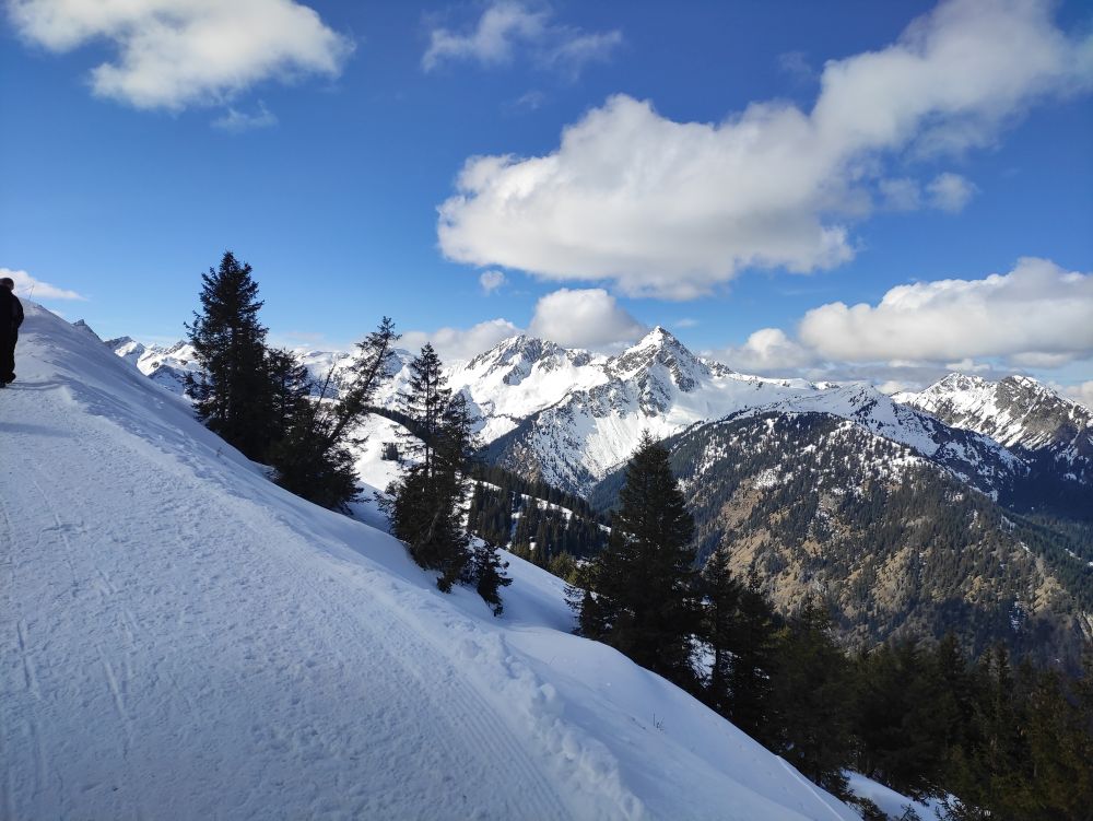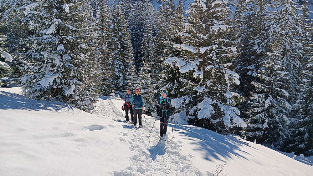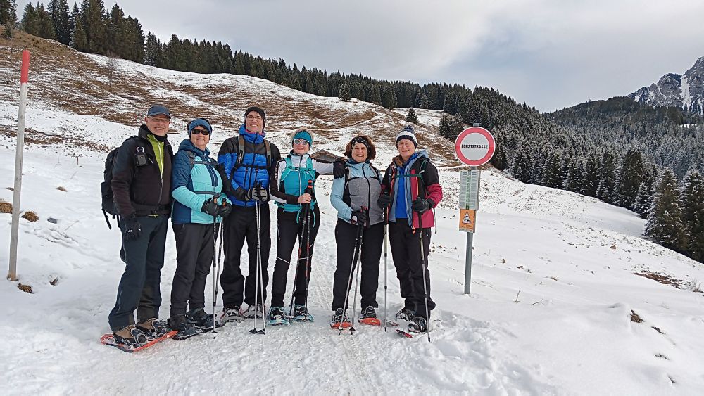 - Tag Am Sonntag trafen wir uns wieder zu sechst am Gasthof Zugspitzblick (1304 m) bei Zöblen. Nach dem Anziehen der Schneeschuhe begannen wir den Aufstieg in Richtung Pirschling. Durch Wälder und über Almen erreichten wir den Fuß des Pirschlings. Den Berg umrundeten wir auf der Westseite. Danach ging es über einen Südhang in der Sonne hoch zu unserem Tagesziel den Schönkahler (1688 m). Unterhalb des Gipfels trennten wir uns, zu dritt stiegen weiter zum Gipfel. Die anderen überquerten den Gipfelgrat des Pirschlings auf dem wir Sie, auf dem Rückweg vom Schönkahler, wieder einholten. Der weitere Weg führte uns durch einen märchenhaften Tannenwald zurück zum Gasthof Zugspitzblick. Dort liesen wir den herrlichen Tag bei Kaffee und Kuchen ausklingen, bevor wir uns auf die Heimfahrt machten.
