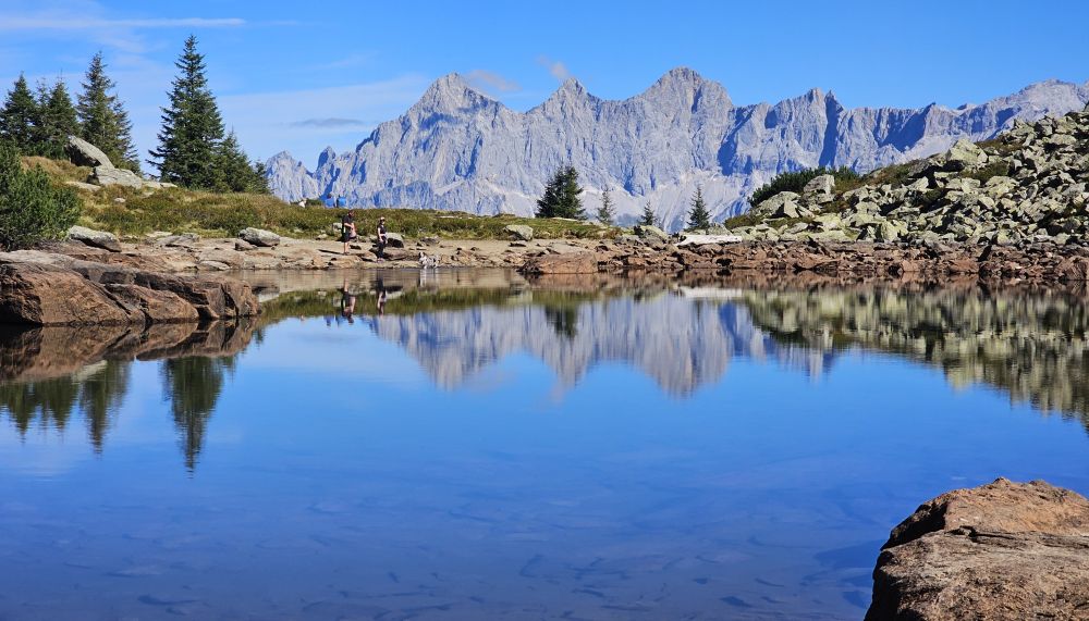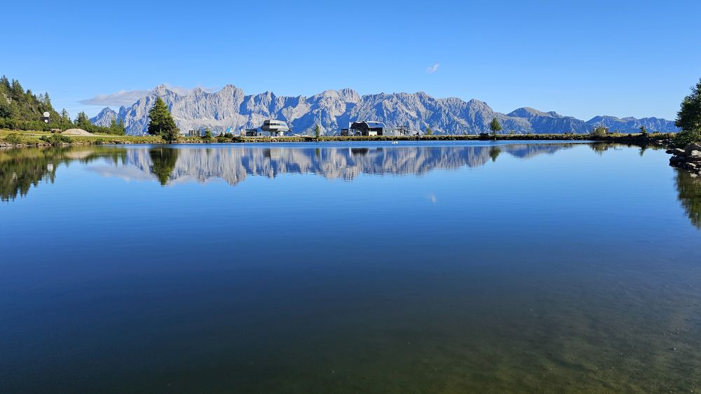 Marc fährt uns mit dem Bus zur Talstation der Reiteralm, die Bergbahn bringt uns dann gleich mal auf 1740 m. Schöne Bergpfade in herrlicher Natur führen uns zum ‚Spiegelsee‘, so benannt, weil sich hier drei Spitzen des Dachsteingebirges herrlich im See spiegeln. Die Ziegen unterwegs fühlen sich von uns Touris überhaupt nicht gestört. Nach einer ausgedehnten Pause nehmen wir dann auch noch einen Abstecher hinunter zum „Untersee“. Dieser Pfad hat es aber in sich, weil wir jeden Schritt auf diesem steilen Felsenpfad mit Bedacht setzen müssen. Einige von uns ziehen mit einem Seilzug ein Holzfloß über den See. Auf einem Rundweg um die Seilbahn, entdecken wir mit Heu abgedeckten Altschnee, Schneereserve für die neue Wintersaison. Etwas erschöpft, aber glücklich und beseelt von der wunderbaren Bergwelt, geht es dann wieder mit Gondel und Bus zurück zum Hotel Waldfrieden Schön, dass wir bei herrlichem Sonnenschein den Wellnessbereich genießen können.